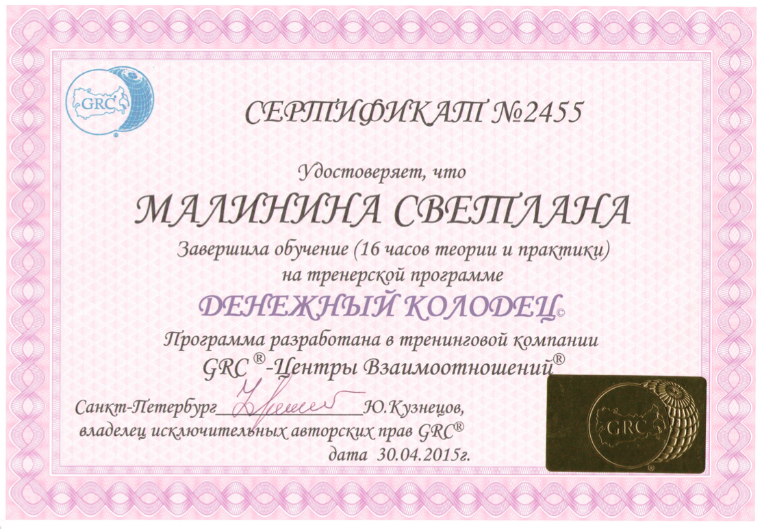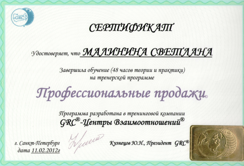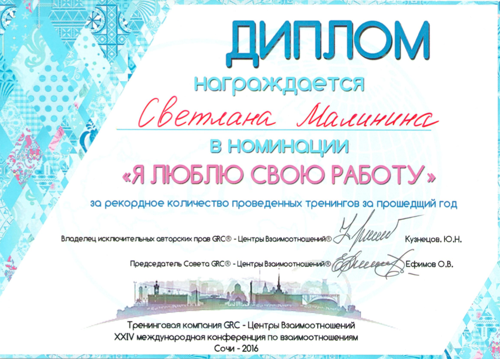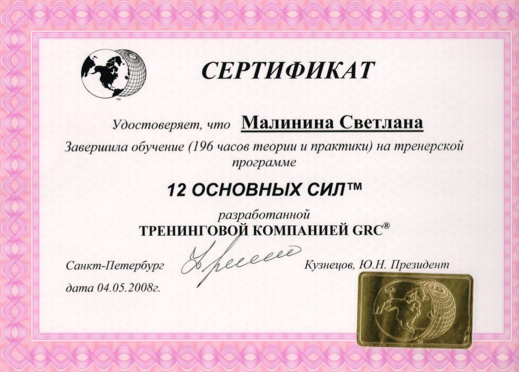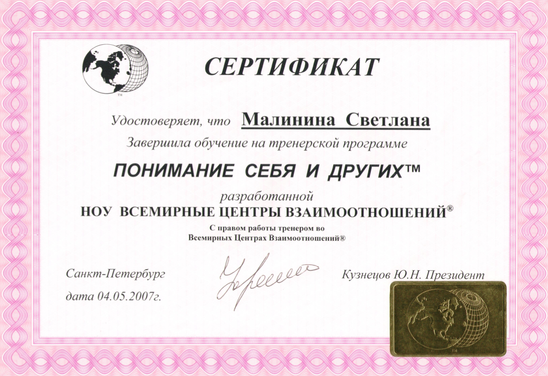 После того как сама в 33 года прошла тренинг «Понимание себя и других» (компания GRC-президент Ю.Н.Кузнецов), влюбилась навсегда в эту специализацию. На сегодняшний день веду пять программ от компании GRC.