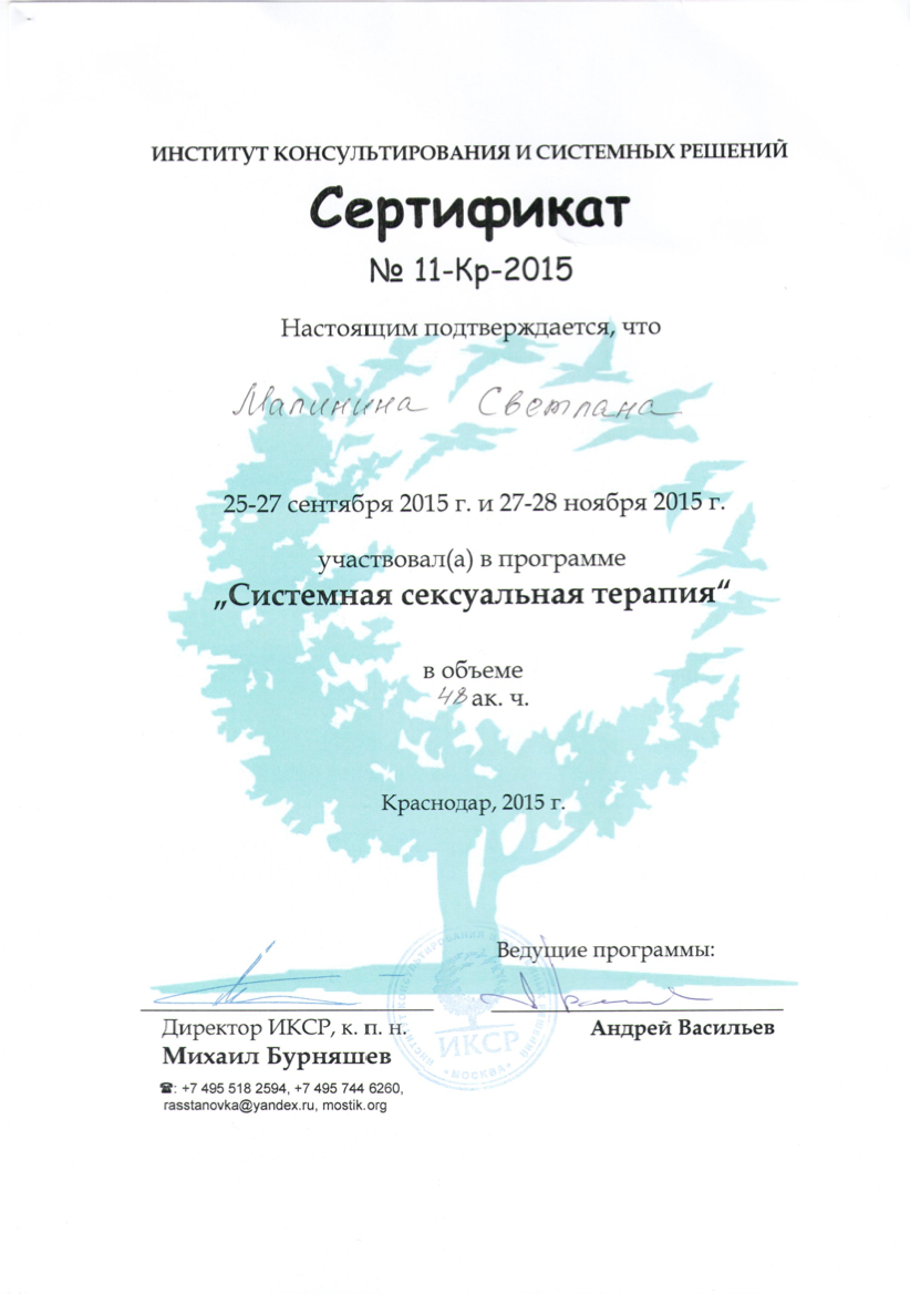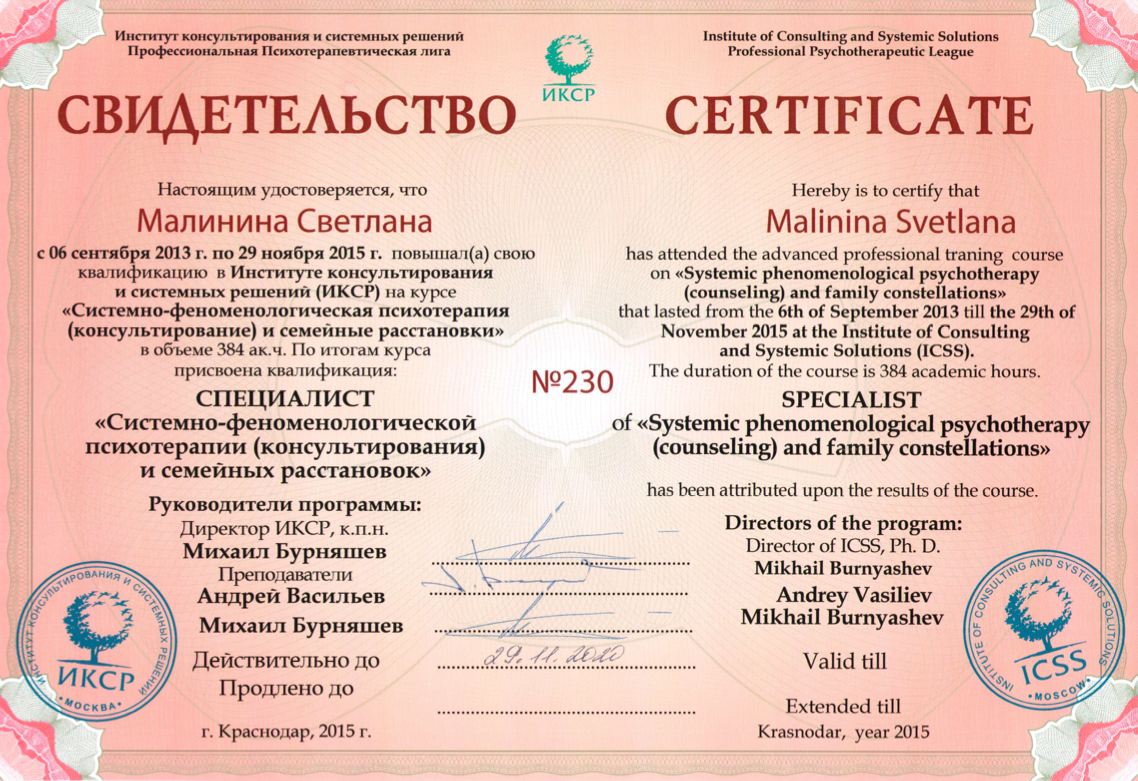 Обязательное психологическое образование, длительный период базового обучения и многочисленные стажировки до начала самостоятельной работы – все это, вместе с обязательной ежегодной сертификацией, дает полноценную гарантию серьезного отношения и профессионального подхода к вашим запросам.
